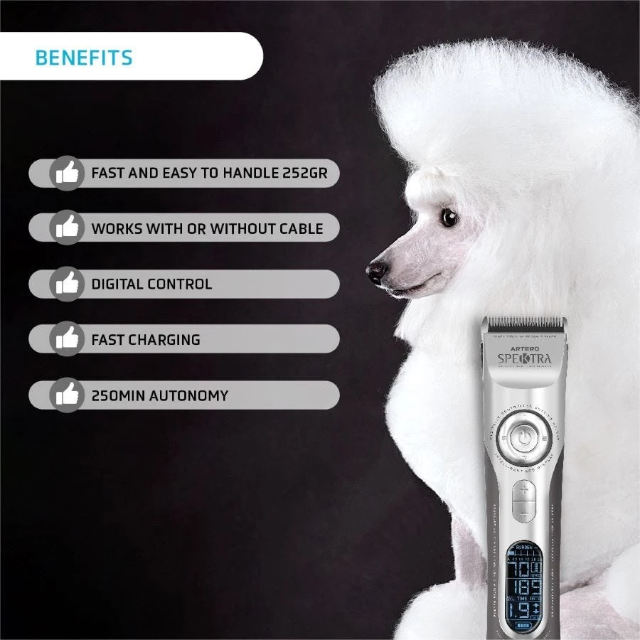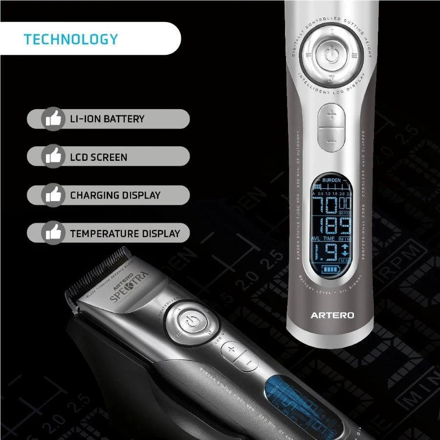 Artero® Spektra 5-speed Cordless Clipper features easy-to-read digital interface and 5-speed control for the ultimate ease of use. 4-in-1 sleek black ceramic blade, digitally adjusted cutting length control. Facilitates smooth fades. Use corded for all day trimming or cordless to reach tough spots with ease. Speed ranges between 5,000 to 7,000 rpm for versatile clipping. 4-hour Lithium-Ion battery life for extended grooming. Includes 4 guard comb attachments, lubricating oil, 4 in 1 blade, charging base, cleaning brush, battery, and electrical plug with adapter for all countries.
