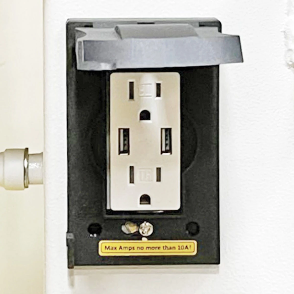 • Two USB outlets for charging and two electrical outlets for corded clippers and dryers keep the floors clear of cables
