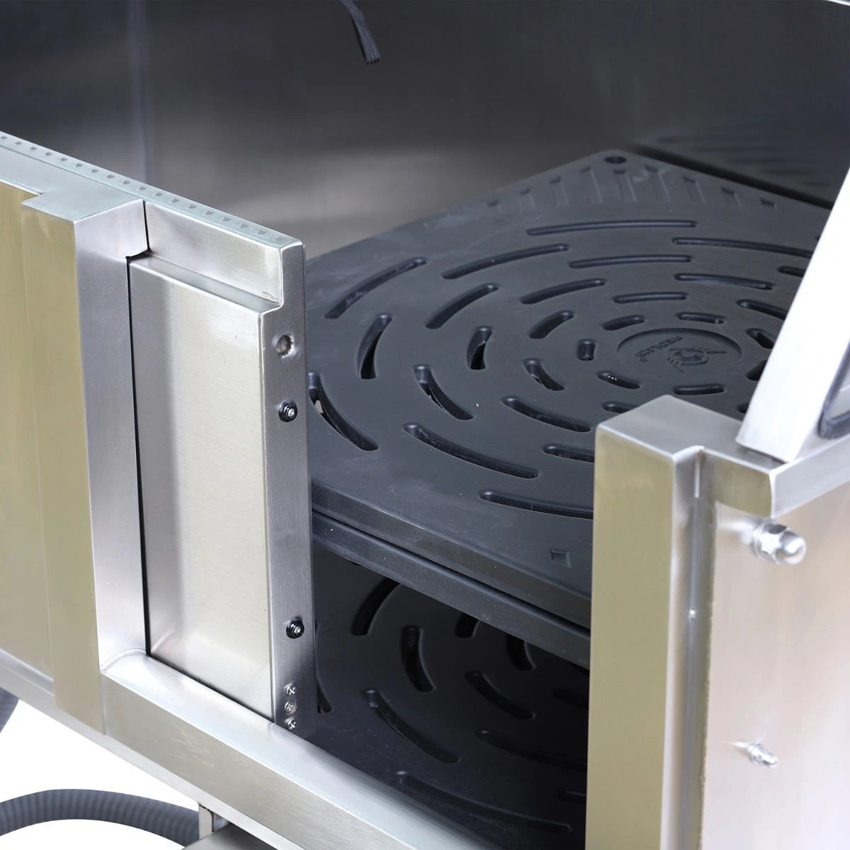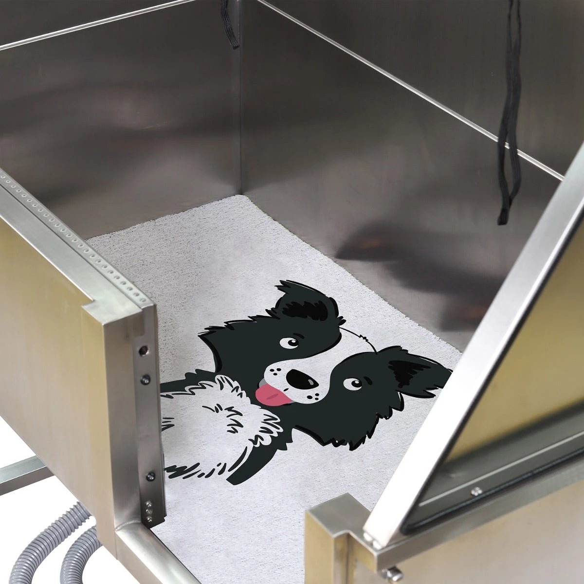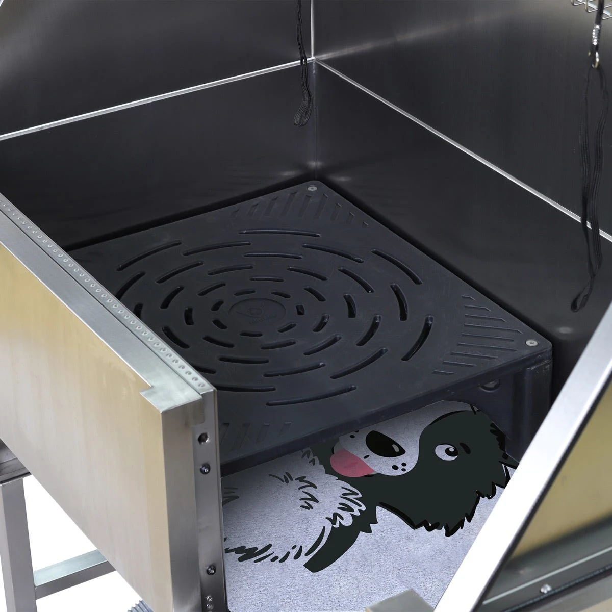 Master Equipment® Pro Deluxe II Stainless Steel Tubs is a truly amazing value for the groomer. Made of durable 18 gauge 304-type stainless steel for long lasting use. Built with a sliding ramp steps with non-slip surfaces and a weight capacity of up to 132 lbs, you can handle even the big dogs without breaking your back. Easily guide dogs of all sizes up the ramp and into the tub. Sturdy overhead arm for restraints features adjustable hooks so you can reposition the restraints as needed, and the overhead arm is removable if desired. Removable door seals tight to help prevent water leaking on floors, edges have rubber piping to prevent cuts and scratches. Tub also includes a beautifully printed anti-slip mat and puppy booster grate for the smaller pets, faucet, storage basket, alloy sprayer, soft hose, restraint loops, sprayer holder, hair catching drainage, and waste pipe.