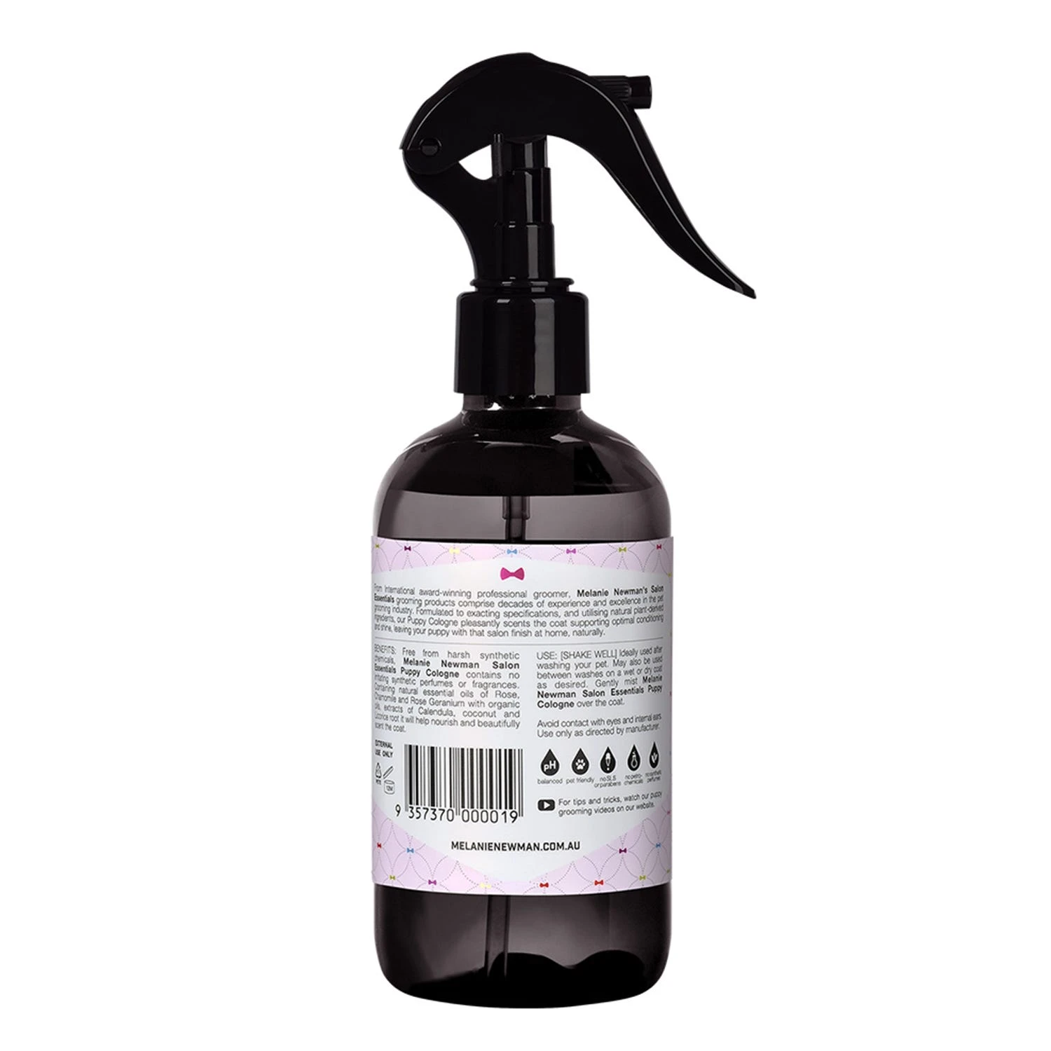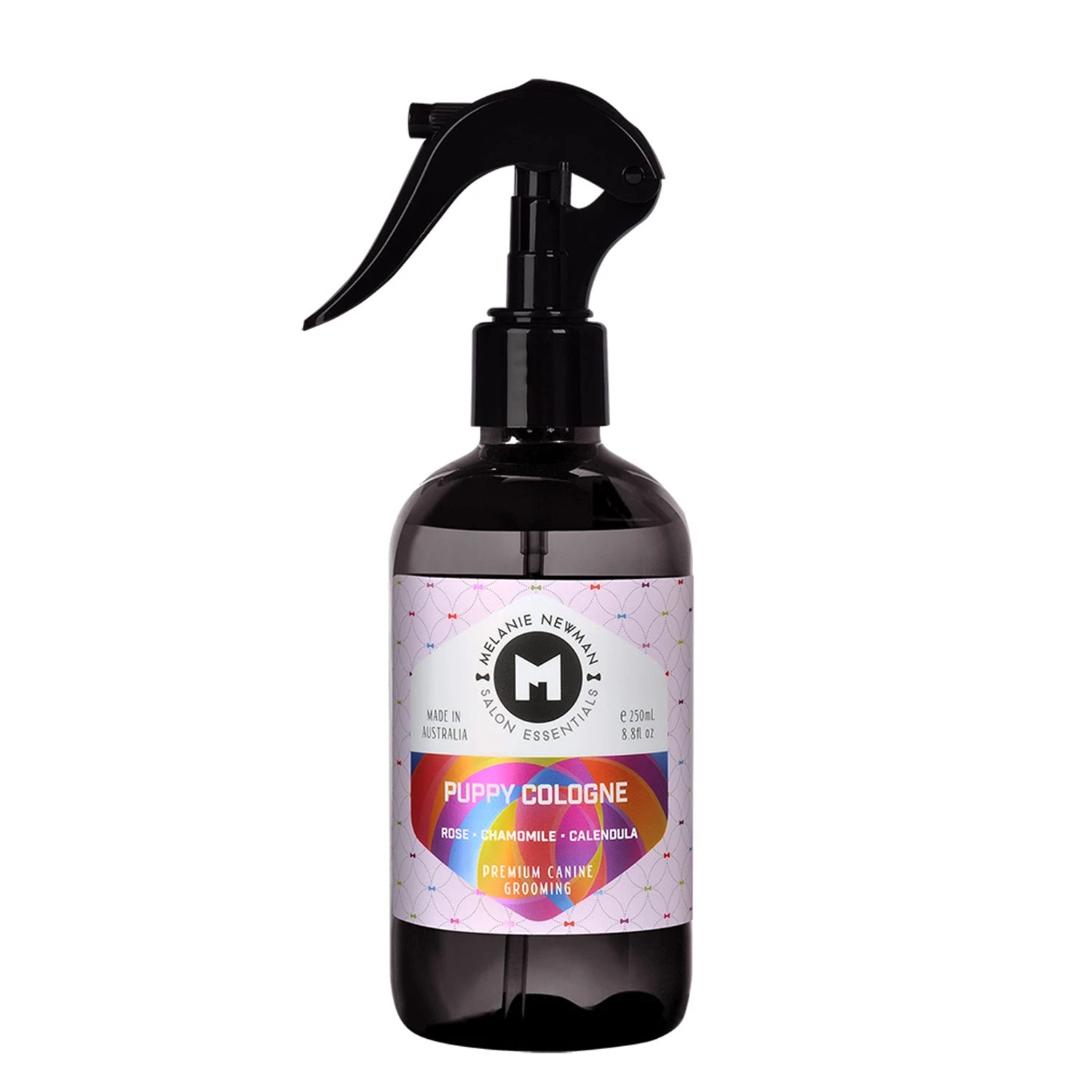 A rich and luxurious blend of Rose, Chamomile, & Calendula. Melanie Newman® Puppy Grooming Cologne is a hydrating spray using therapeutic grade essential oils to use on coats in between, after a bath, or on bedding. Helps maintain that freshly groomed scent at home. Melanie Newman Salon Essentials Puppy collection is formulated all Breeds and coat types with odor fighting and calming properties through the blend of natural essential oils, Aloe Vera leaf juice, licorice root and coconut oil. 8.8 oz