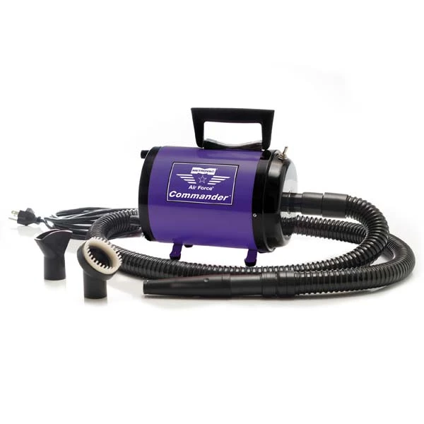 Free accessory kit includes a 6-foot flexible hose with air-flow control, air concentrator, air flare, and a groomer rake. For use as a floor or table dryer. Metro Air Force Commander Dryers are available in 1.17, 1.7, and 4.0 horsepower motors.